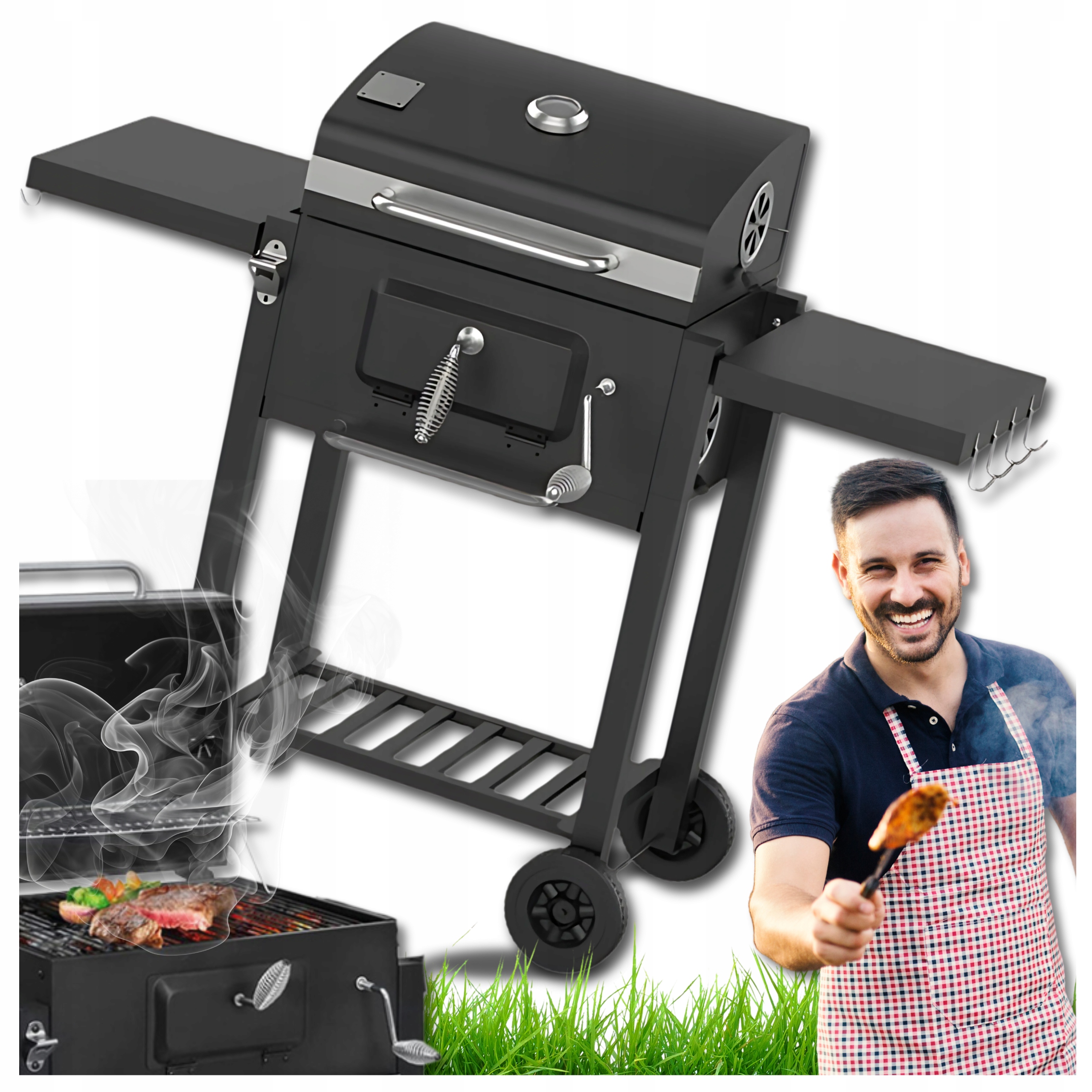 Wysokość rusztu można regulować za pomocą korby dzięki czemy możemy dodatkowo oddziaływać na temperaturę wewnątrz